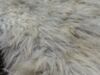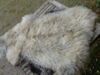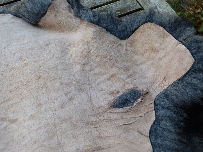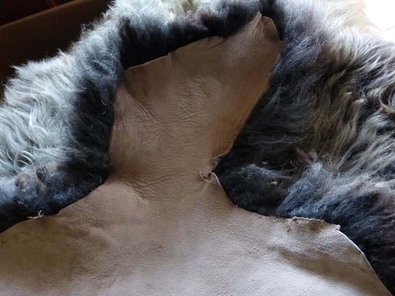 mittelgroßes Lammfell geschoren, hellgrau mit zartem Aalstrich, der Hals ist schief geschnitten, sieht man besser von der Lederseite